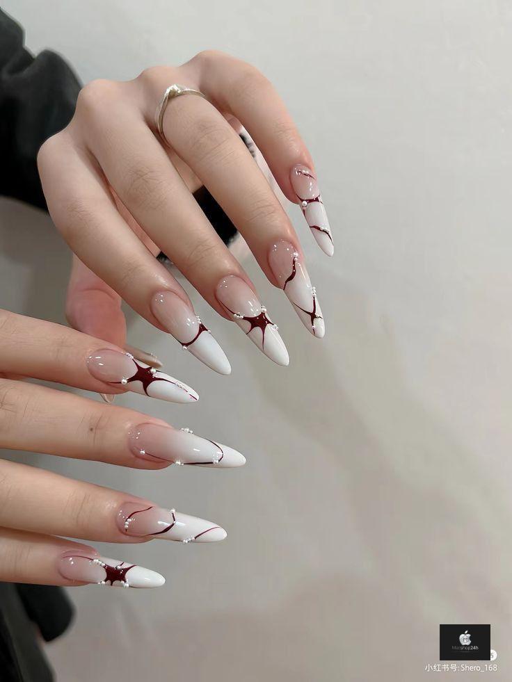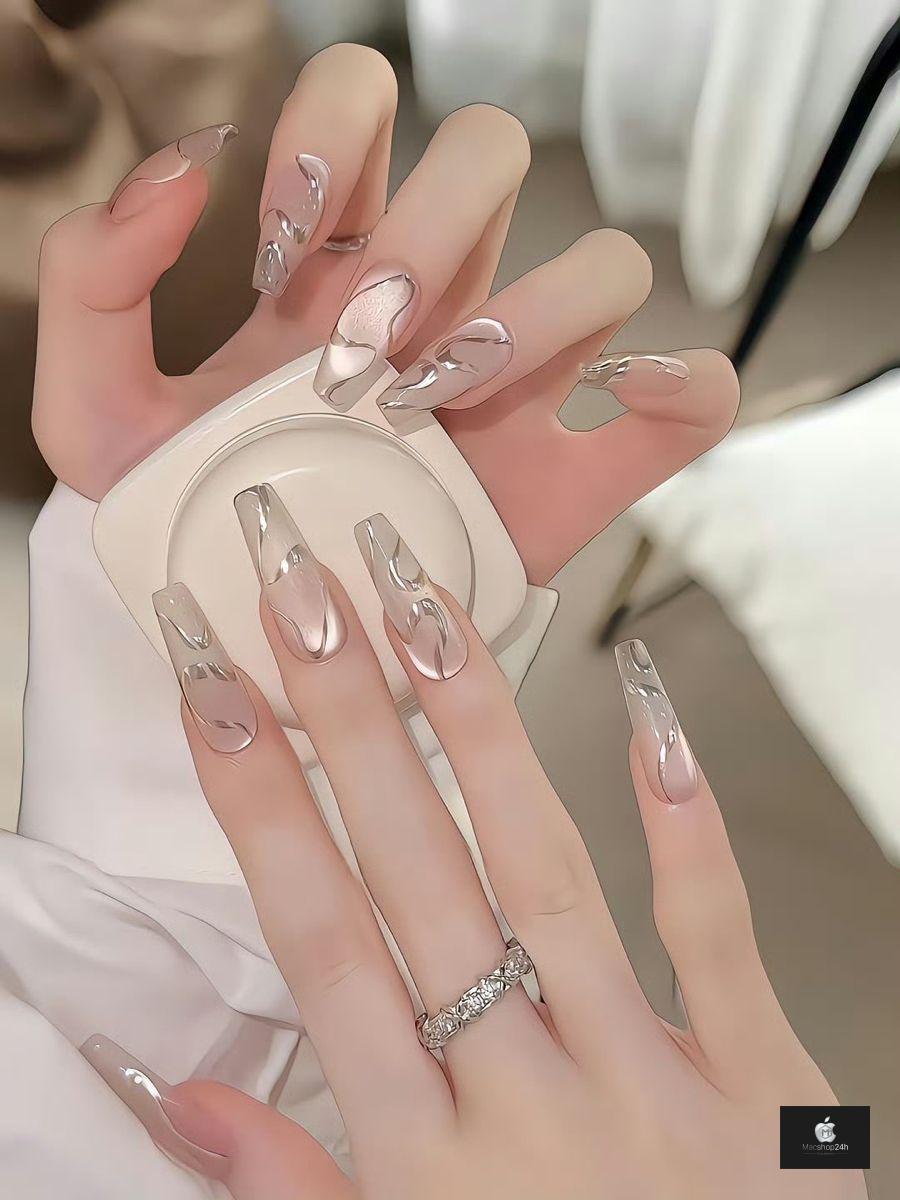 Thay vì trang trí dày đặc, người thợ nail chỉ khéo léo thêm một vài điểm nhấn như line bạc mảnh, một viên đá nhỏ, hoa văn tối giản hoặc họa tiết hình học.